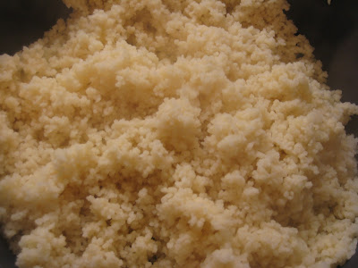 É só colocar 1 copo e 1/2 de cuscus numa taça e regar com o mesmo volume (1 copo e 1/2) de água a ferver. Eu também adiciono uma pitada de sal fino e umas nozes de manteiga.