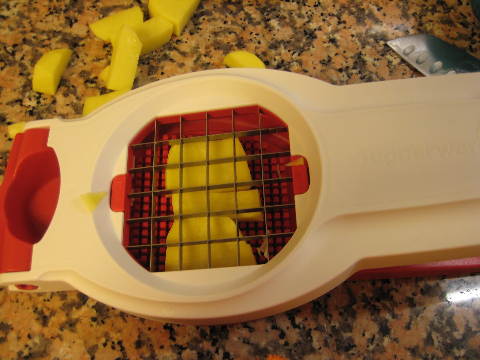 Descasque as batatas e corte-as em cubos (eu usei o Multifunções da Tupperware, que também uso para cortar batatas em palitos).